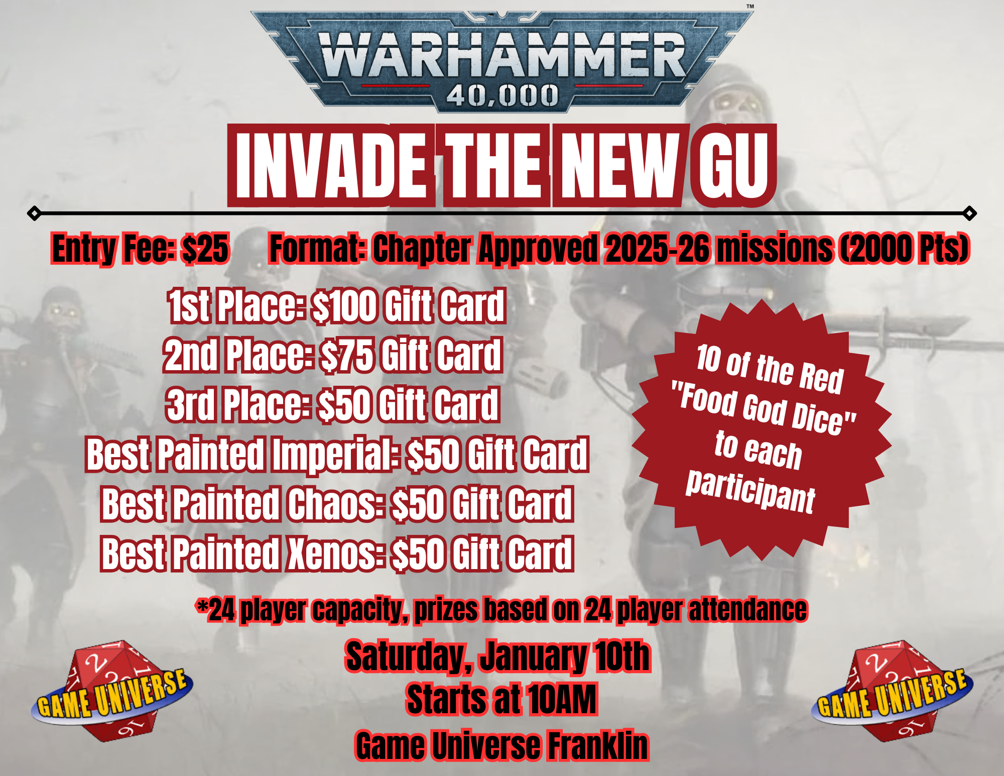 We will be using the Chapter approved 2025-26 Missions and Everyone should have a 2000 point army. Points and Rules are as of January 3rd. Any official changes after that will not be in use.