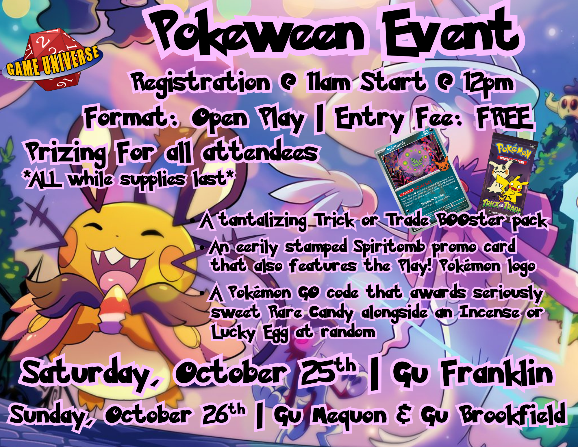 All Attendees will receive a Spiritomb promo and a Trick or Trade BOOster, along with a Pokemon GO Code that will randomly award either a Rare Candy, Incense, or Lucky Egg.
