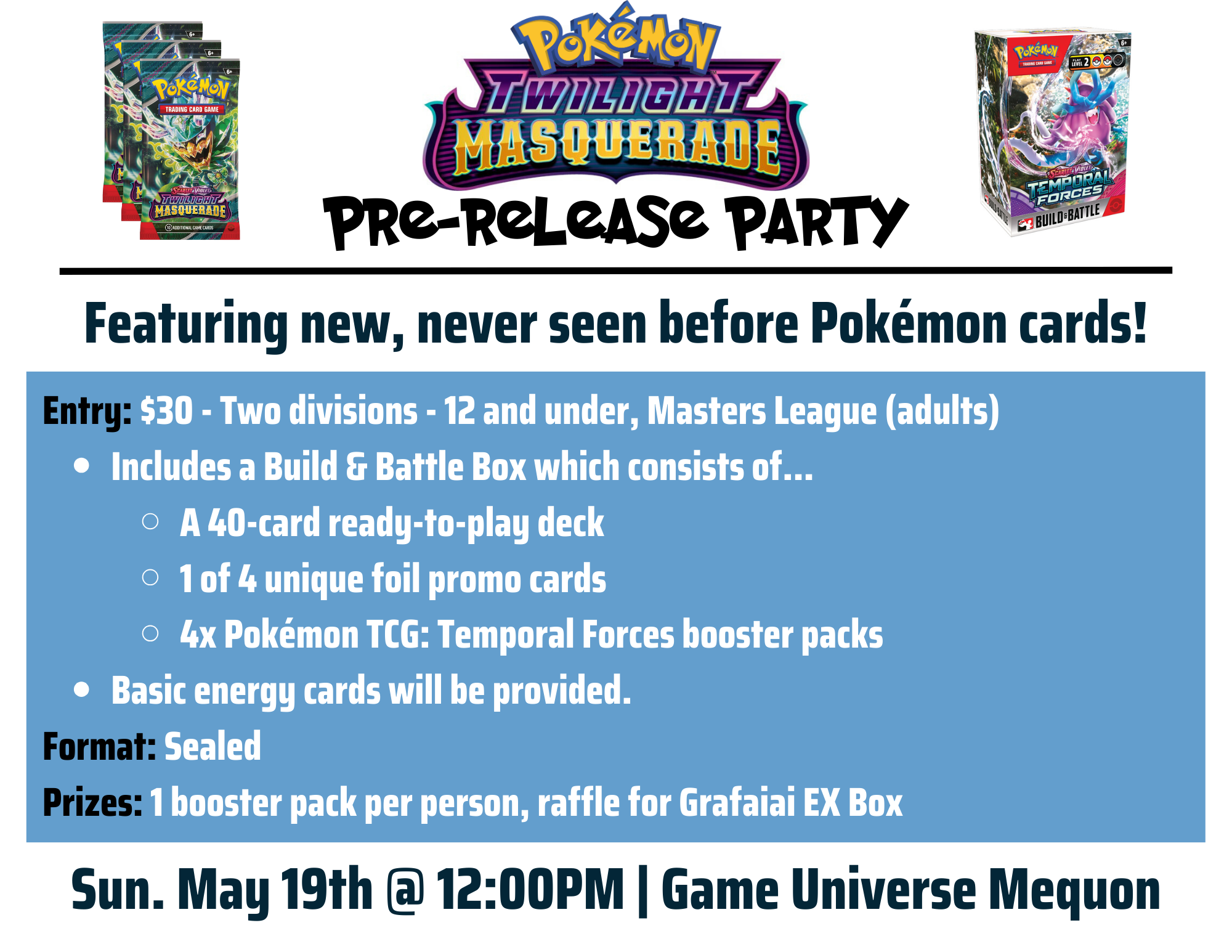 We are holding a pre-release party for Pokémon TCG’s newest release, Twilight Masquerade, at our Mequon location!