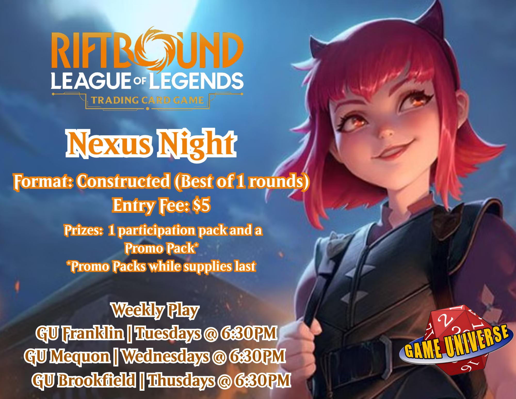 Riftbound is a collectable card game featuring a vast array of characters and locales from League of Legends! Join us and play this highly anticipated release!