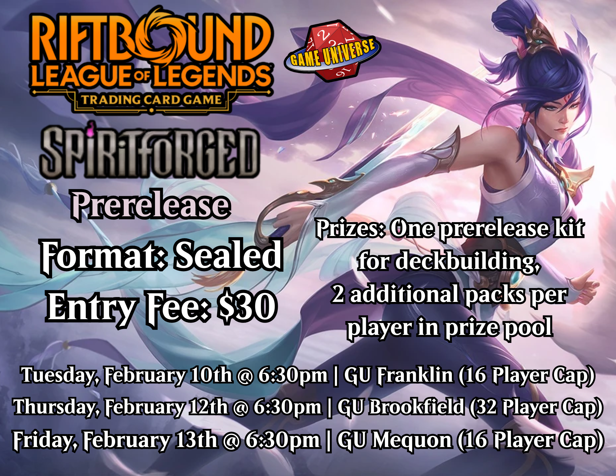 Tuesday, February 10th @ 6:30pm | GU Franklin (16 Player Cap) 〰️ Thursday, February 12th @ 6:30pm | GU Brookfield (32 Player Cap) 〰️ Friday, February 13th @ 6:30pm | GU Mequon (16 Player Cap) 〰️