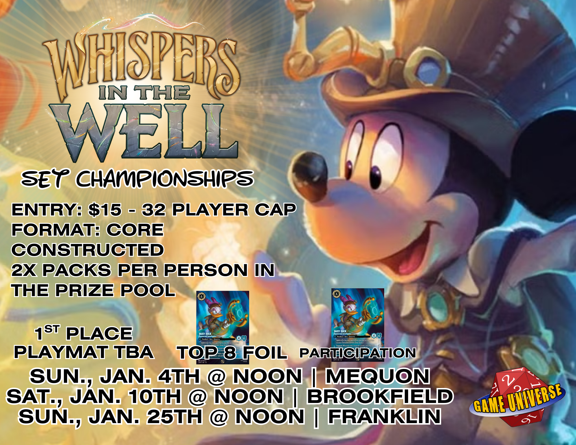 The Lorcana Whispers in the Well Set Championship is a tournament for the Disney Lorcana card game. The tournament is played in a Core (Constructed) format, and the rounds are best of three games. The structure of the tournament may include Swiss rounds and a Top Cut, depending on the number of attendees.