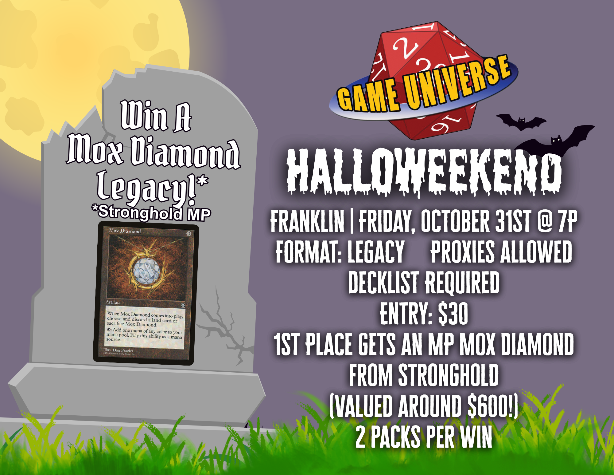 Join us at Game Universe in Franklin Friday, Oct. 31st at 7P and you could win a Mox Diamond valued around $600!